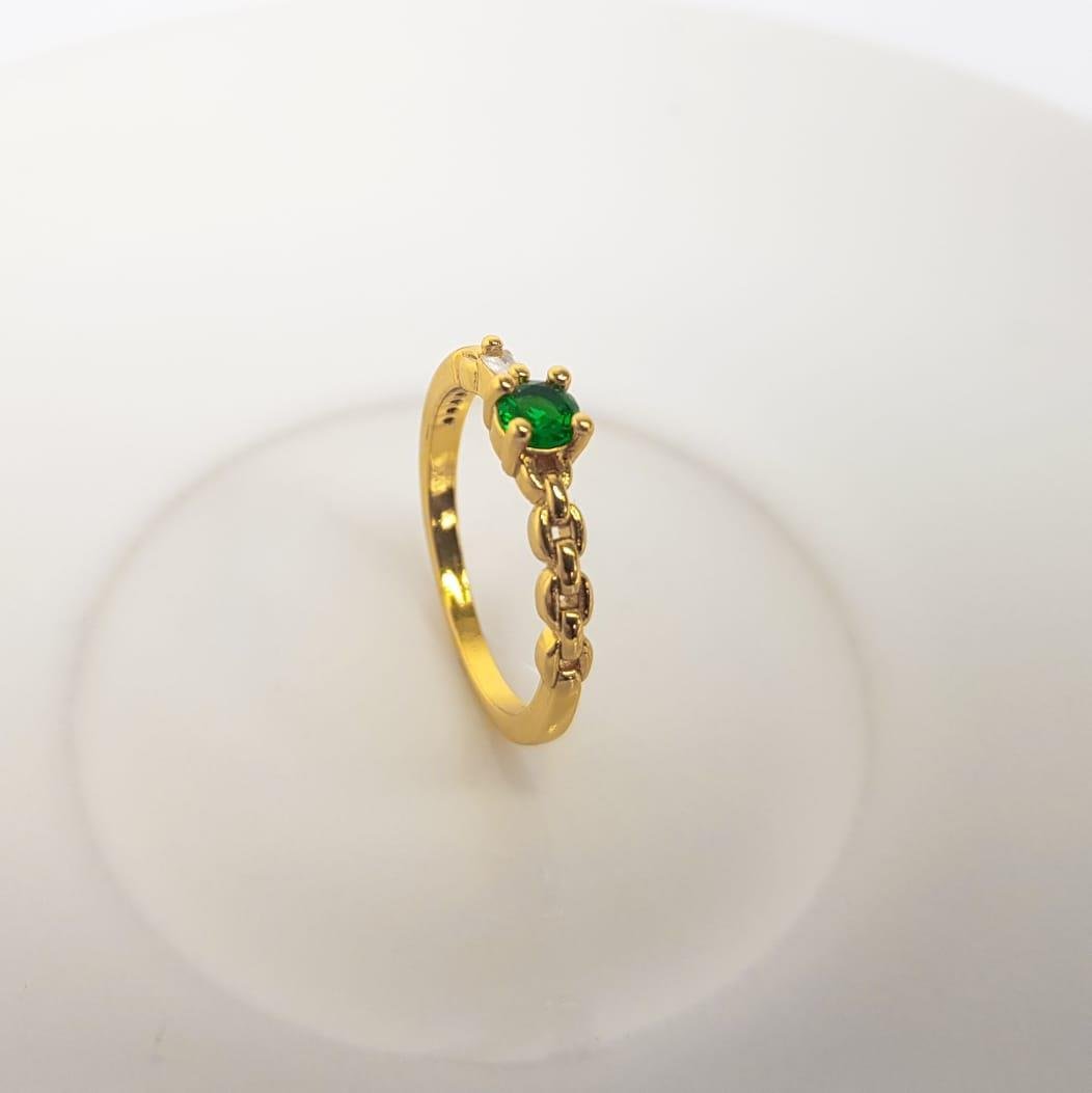 ANEL COM ZIRCÔNIA VERDE-BAGUETE CRISTAL-FILETE CRAVEJADO E MEIO TRANCADO | BANHADO EM OURO 18K